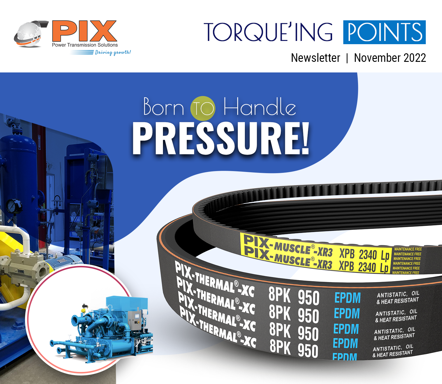 Die Riemen in Kompressorantrieben sind im Betrieb permanent extrem starken Vibrationen und Stoßbelastungen ausgesetzt. PIX stellt eine breite Palette an robusten Lösungen her, die diesen Herausforderungen zweifelsohne standhalten und eine störungsfreie Kraftübertragung gewährleisten.